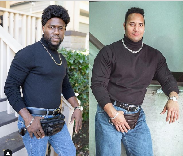 Kevin Hart dressed up as The Rock for Halloween… As reported by CNN, “Hart donned the now famous 90s look of Johnson in a black turtleneck, gold chain, jeans and a fanny pack.”